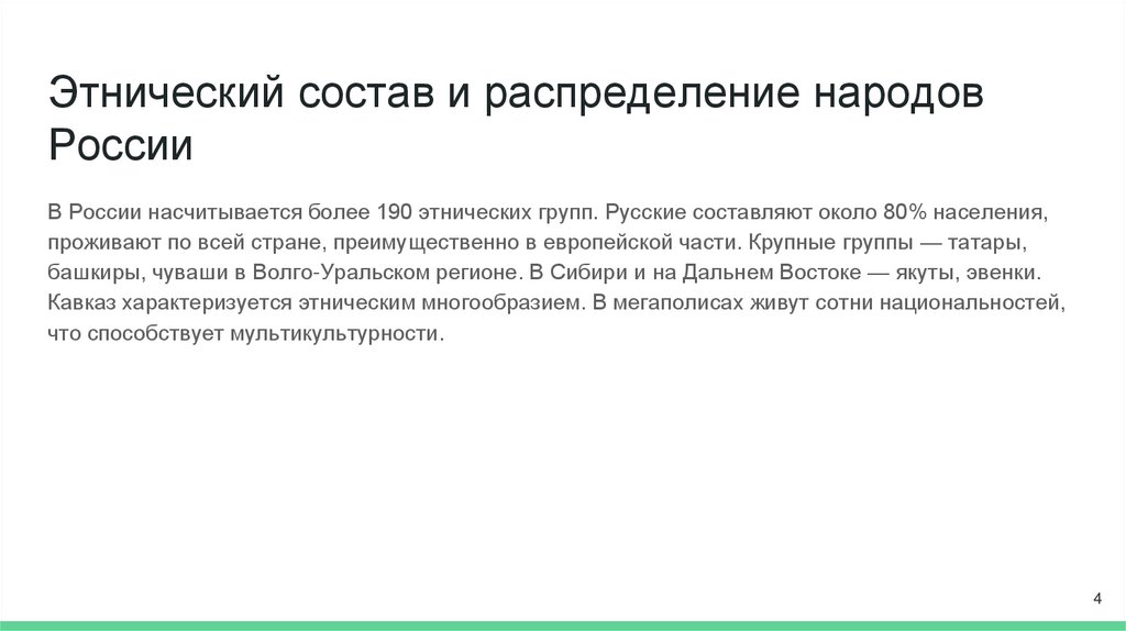 В России насчитывается более 190 этнических групп. Русские составляют около 80% населения,