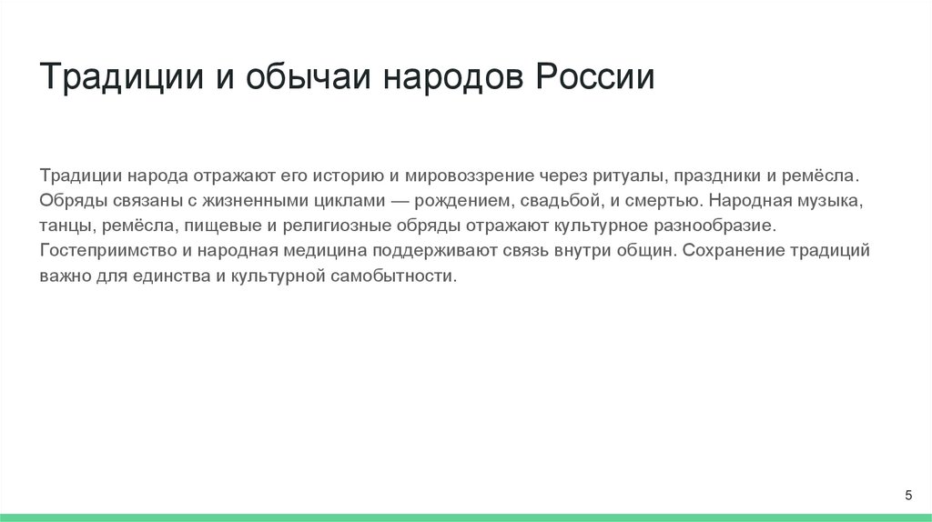 Традиции и обычаи народов РоссииТрадиции народа отражают его историю и мировоззрение через ритуалы, праздники и ремёсла.