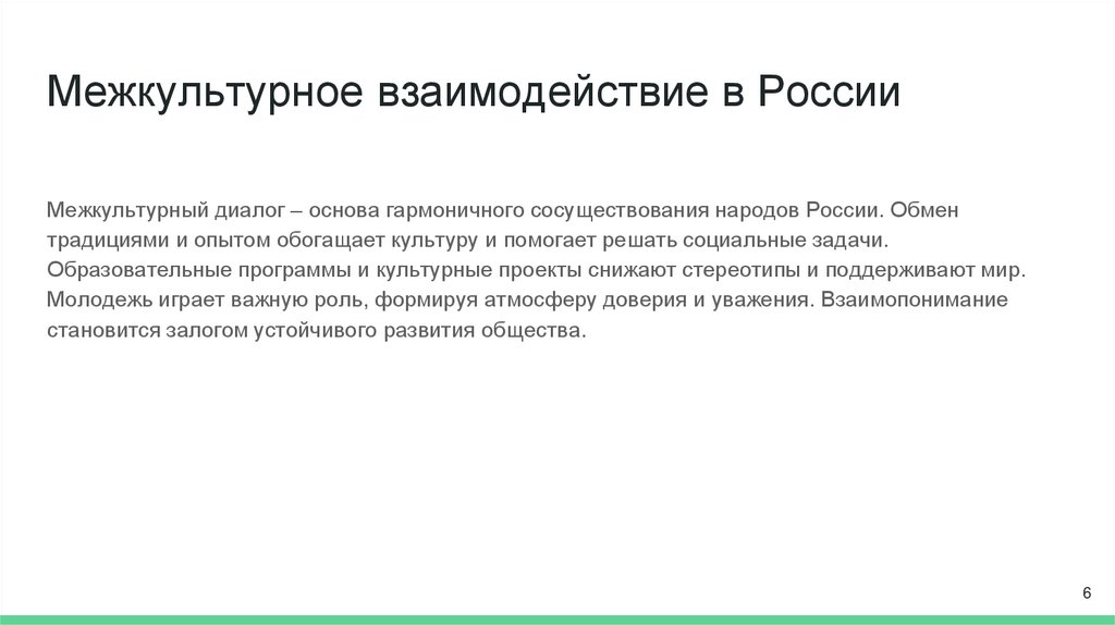 Межкультурное взаимодействие в РоссииМежкультурный диалог – основа гармоничного сосуществования народов России. Обмен