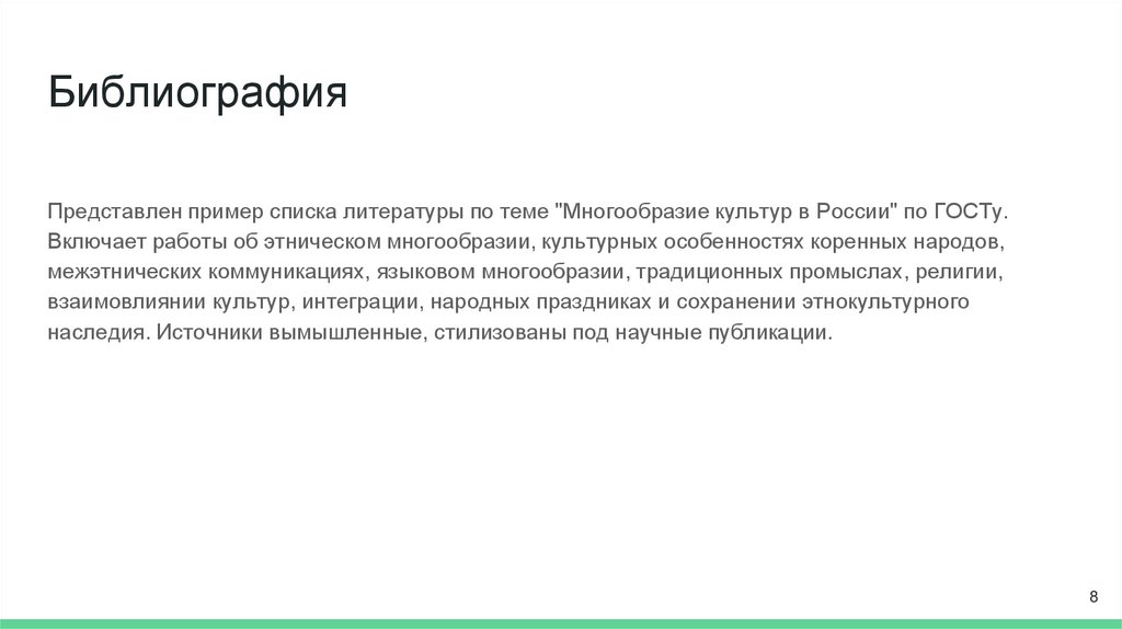 БиблиографияПредставлен пример списка литературы по теме "Многообразие культур в России" по ГОСТу.