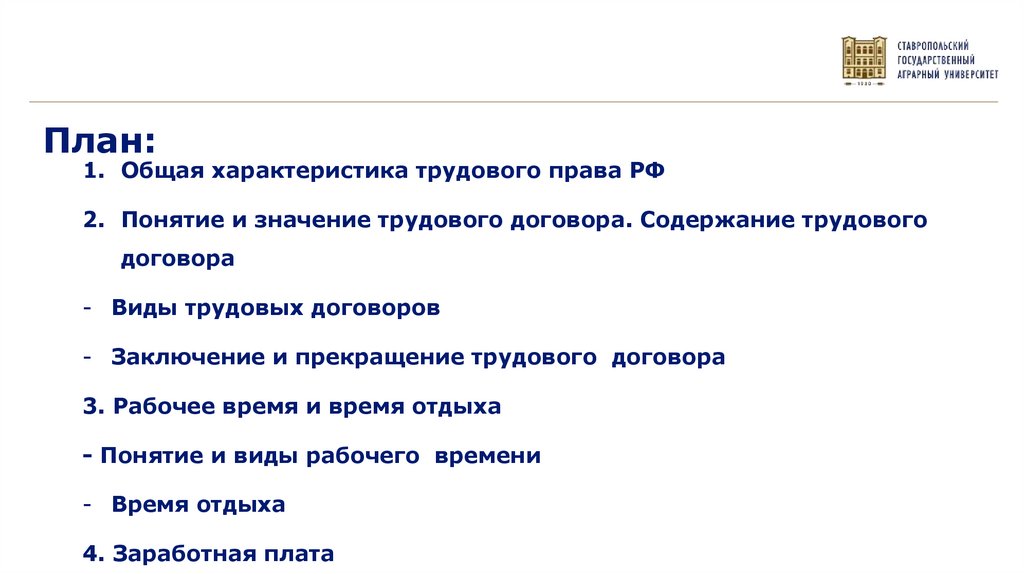 План:1. Общая характеристика трудового права РФ