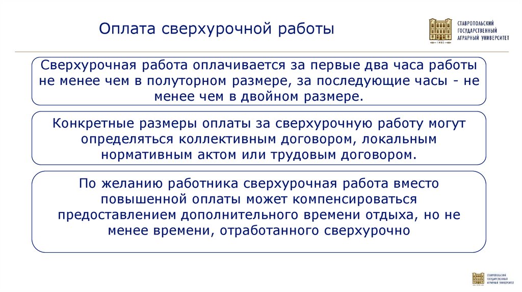 Оплата сверхурочной работыСверхурочная работа оплачивается за первые два часа работы