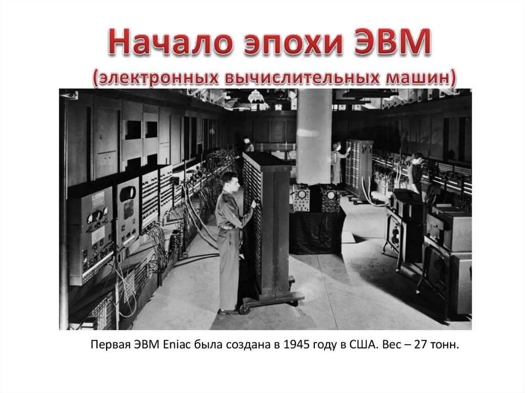 Первая ЭВМ Eniac была создана в 1945 году в США. Вес – 27 тонн.3.
