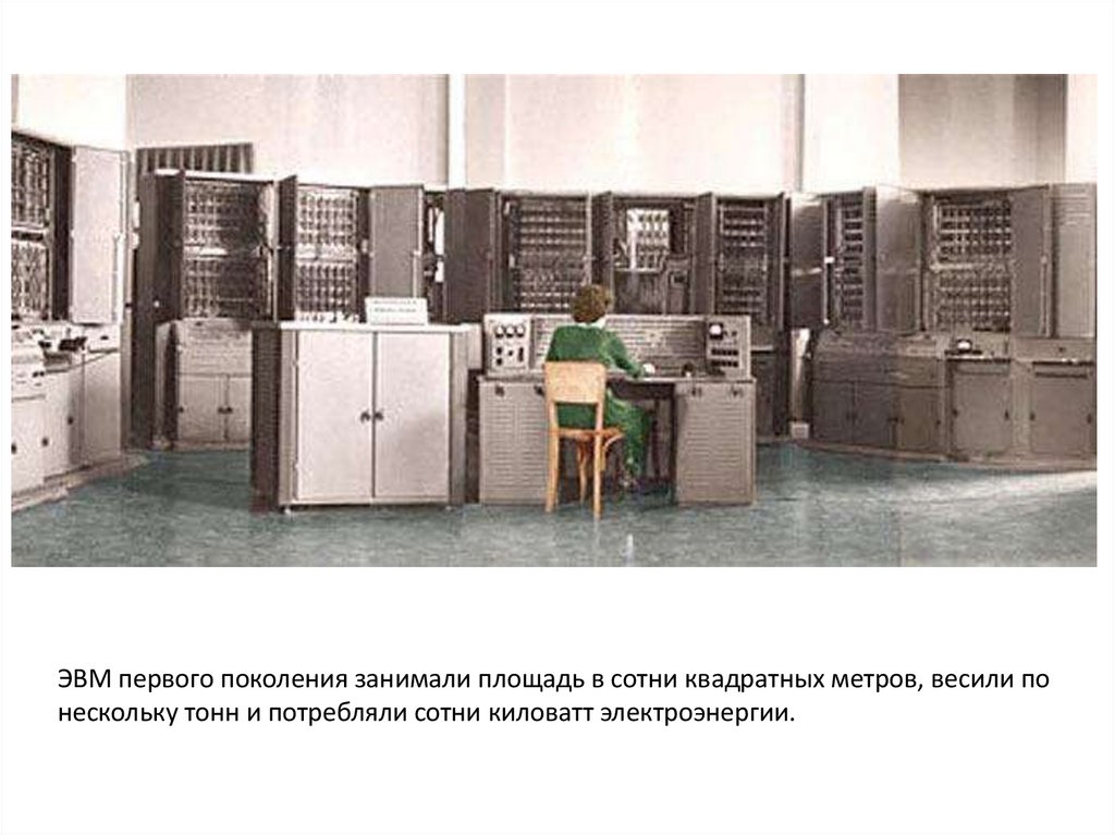 ЭВМ первого поколения занимали площадь в сотни квадратных метров, весили понескольку тонн и потребляли сотни киловатт электроэнергии.