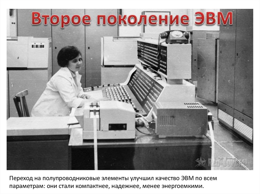 Переход на полупроводниковые элементы улучшил качество ЭВМ по всемпараметрам: они стали компактнее, надежнее, менее энергоемкими.