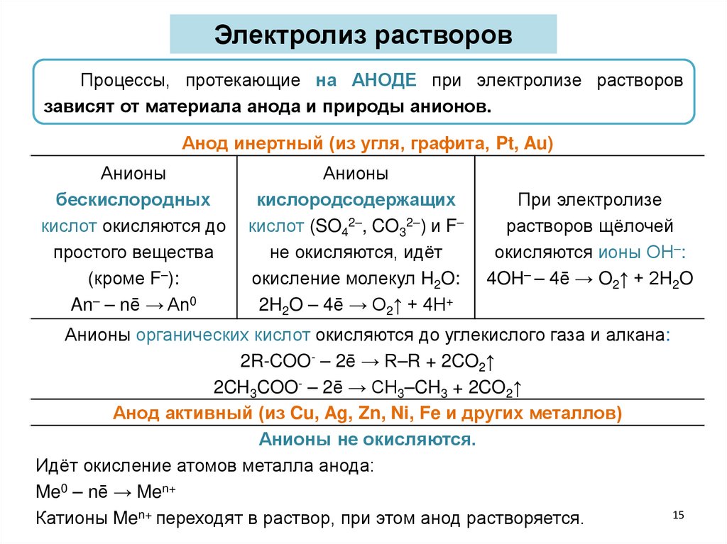 Анод активный (из Cu, Ag, Zn, Ni, Fe и других металлов)