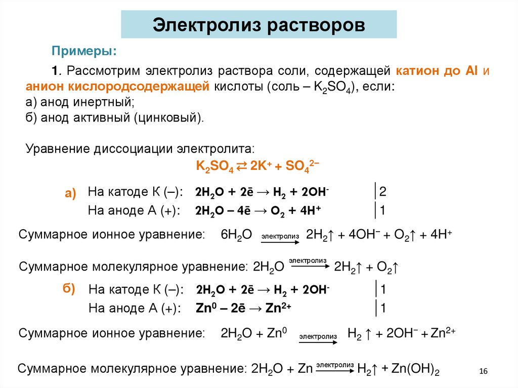На катоде К (–): 2H2O + 2ē → H2 + 2OHНа аноде А (+): Zn0 – 2ē → Zn2+