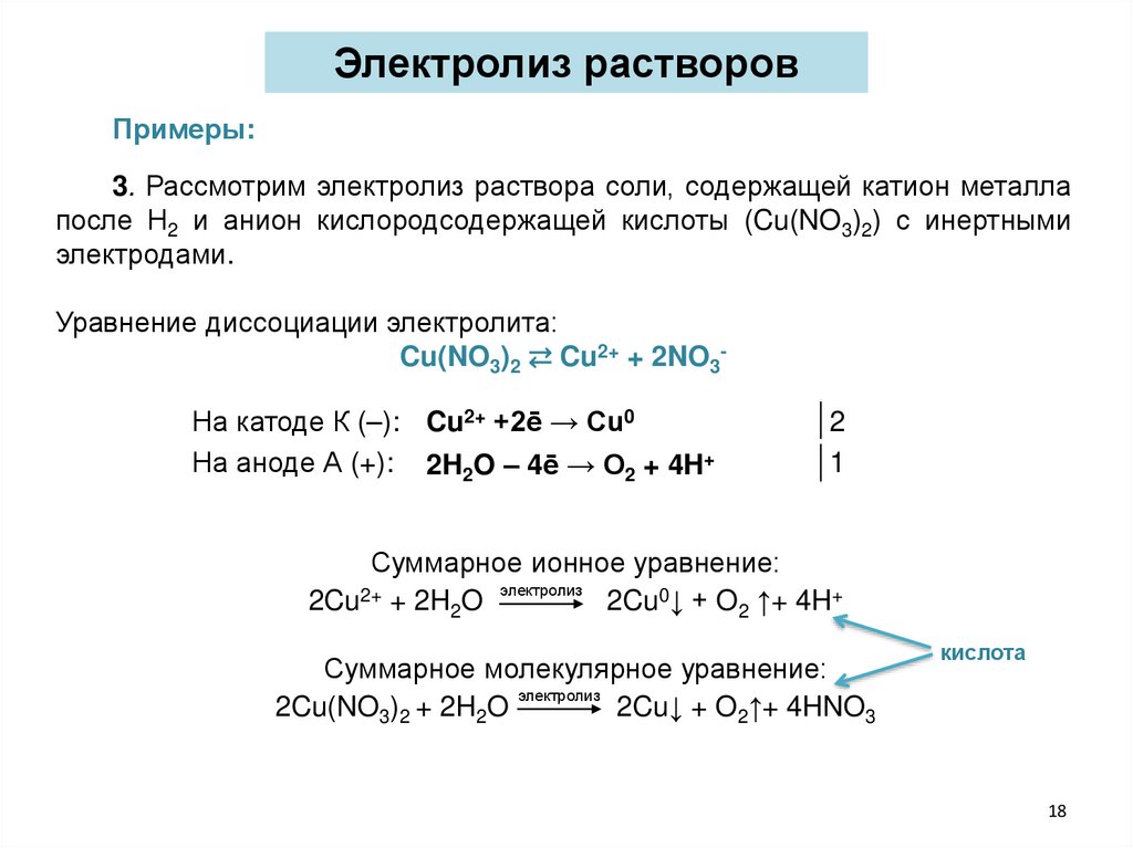 Cu(NO3)2 ⇄ Cu2+ + 2NO3На катоде К (–): Cu2+ +2ē → Cu0