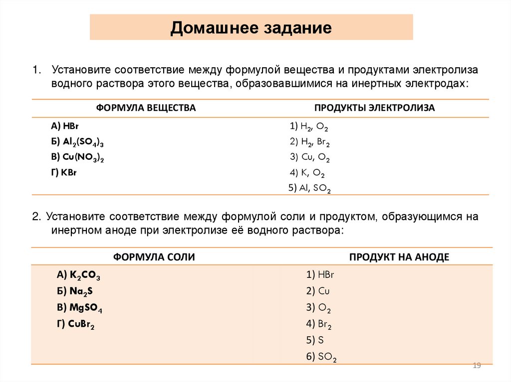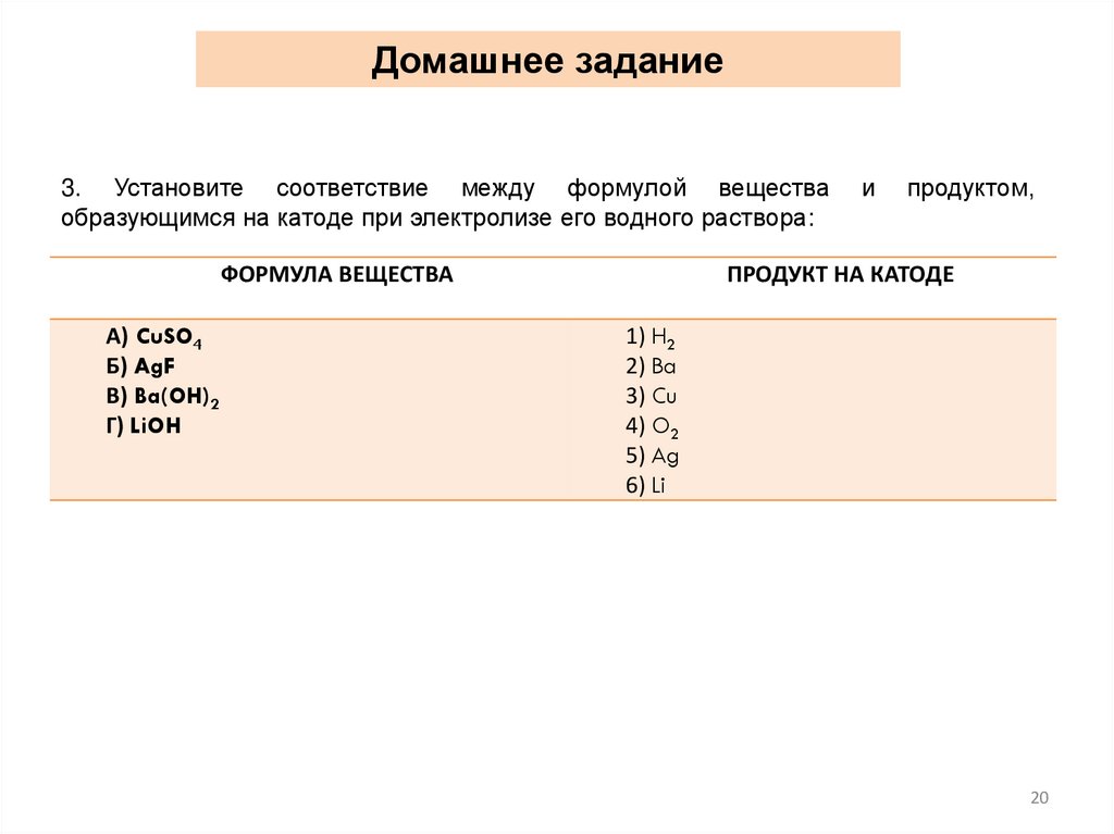 Домашнее задание1. Установите соответствие между формулой вещества и продуктами электролиза