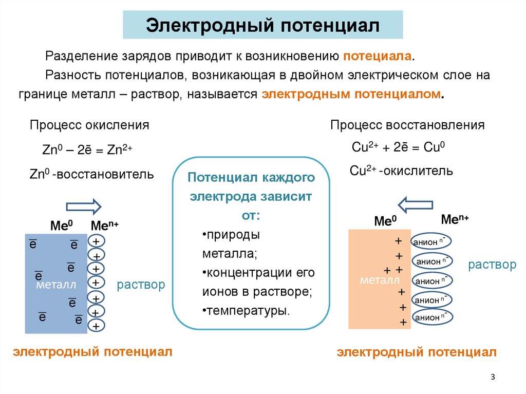 Электродный потенциалРазделение зарядов приводит к возникновению потециала.