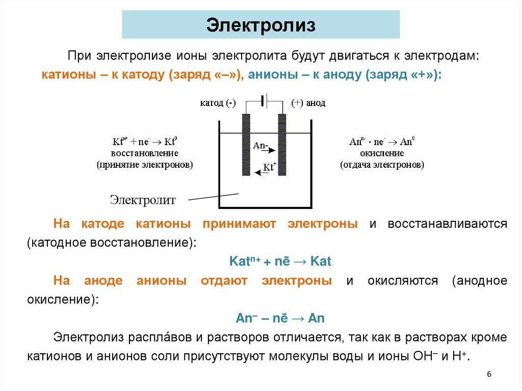 катионы – к катоду (заряд «–»), анионы – к аноду (заряд «+»):