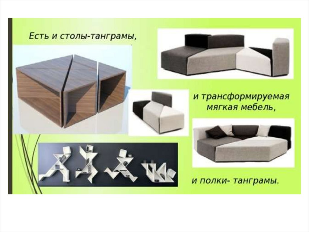 • Есть и столы-танграмы, и трансформируемаямягкая мебель, и корпусная мебель.