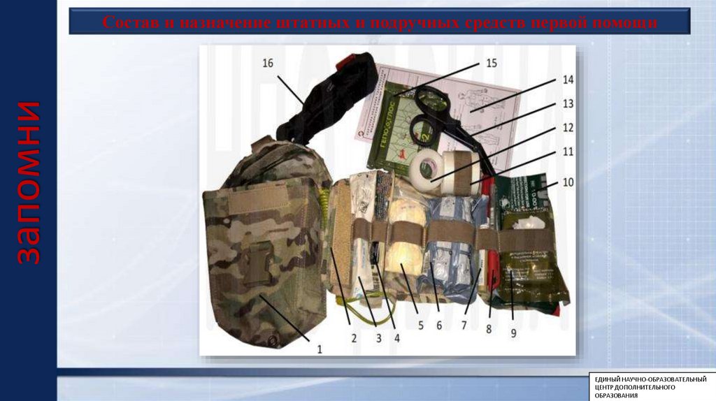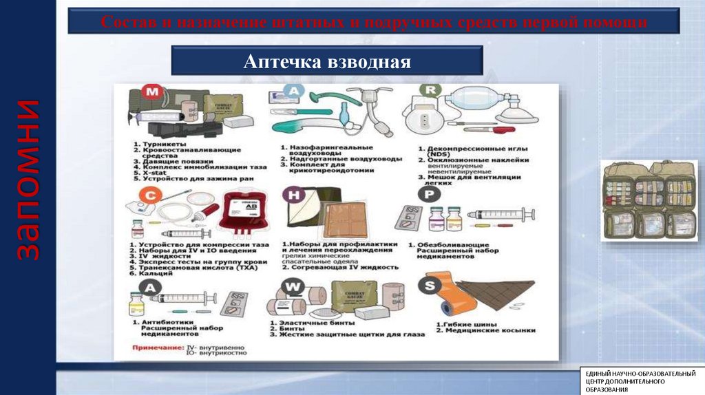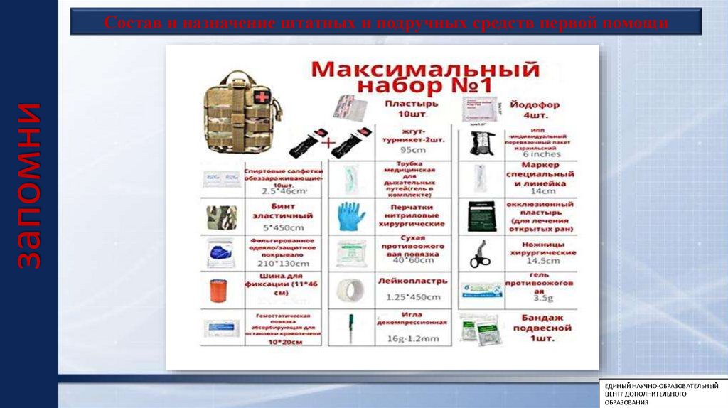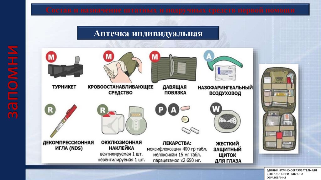 запомниСостав и назначение штатных и подручных средств первой помощи