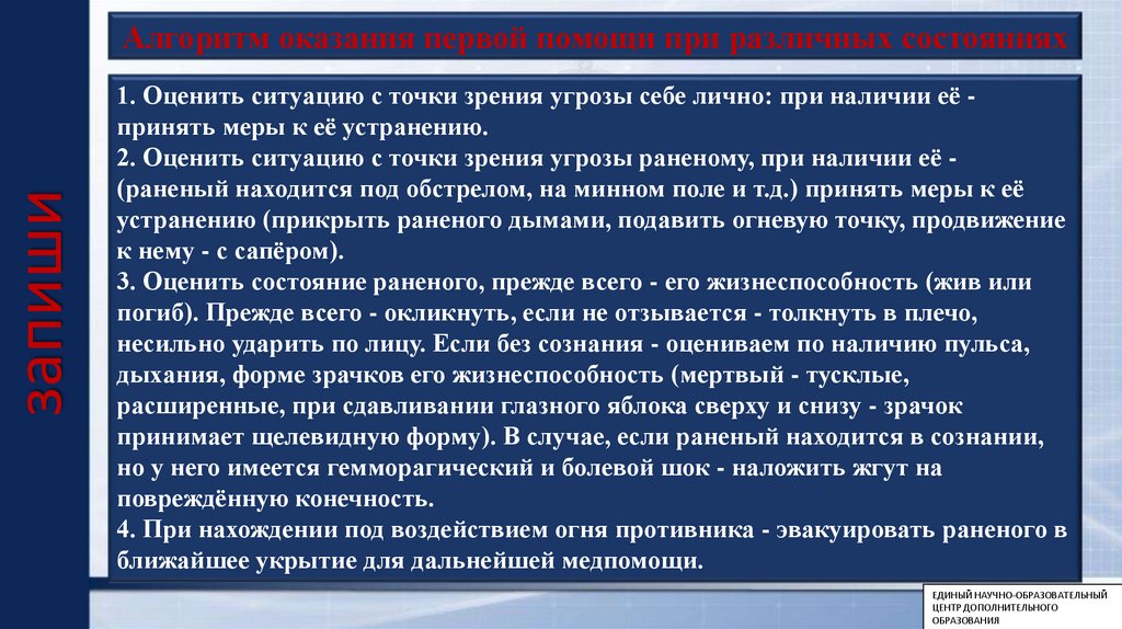 запишиАлгоритм оказания первой помощи при различных состояниях