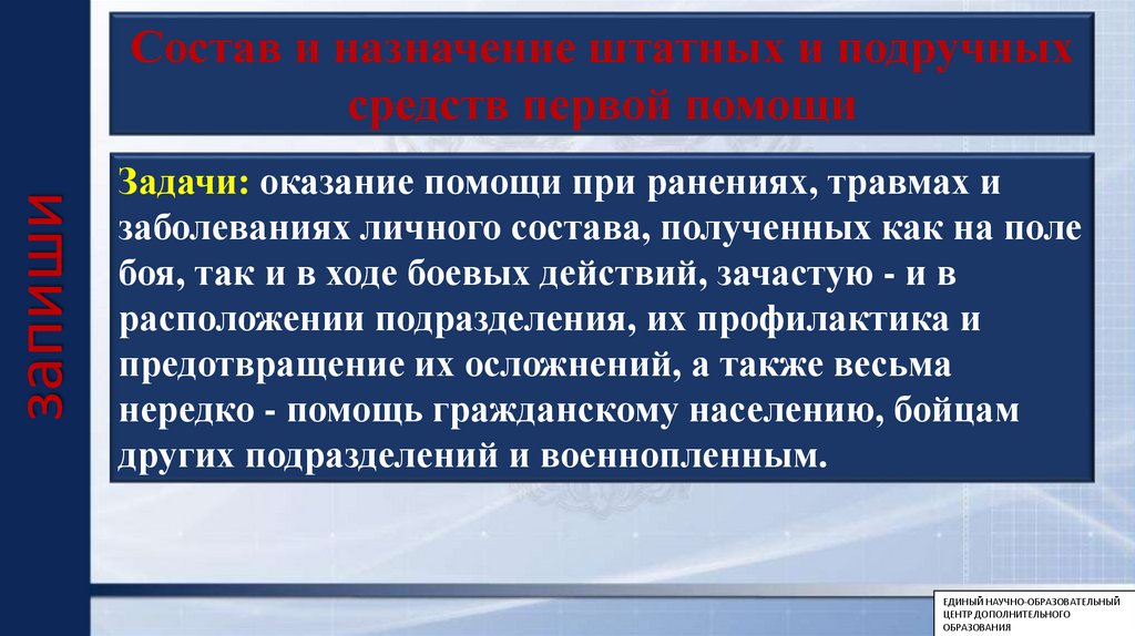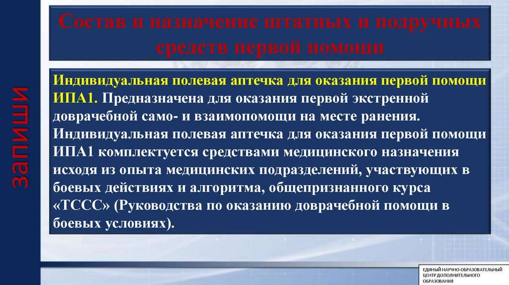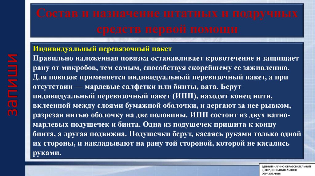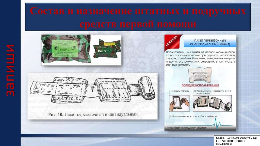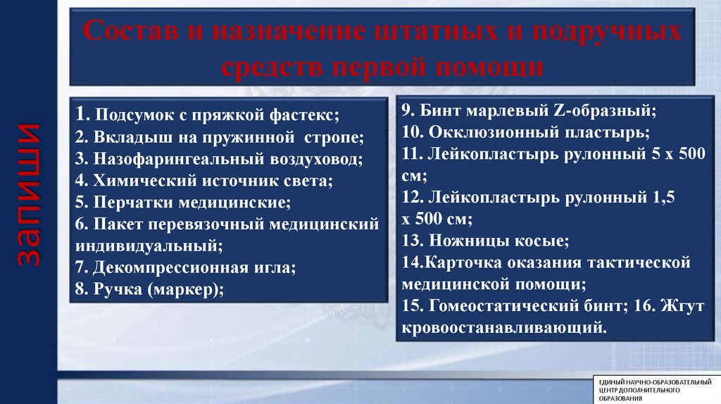 Состав и назначение штатных и подручных средств первой помощизапомни