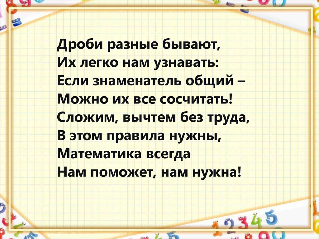 Дроби разные бывают,Их легко нам узнавать: