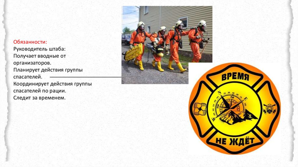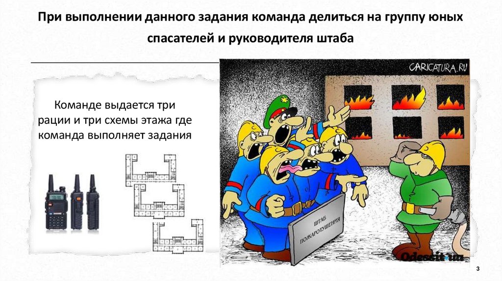 При выполнении данного задания команда делиться на группу юныхспасателей и руководителя штаба