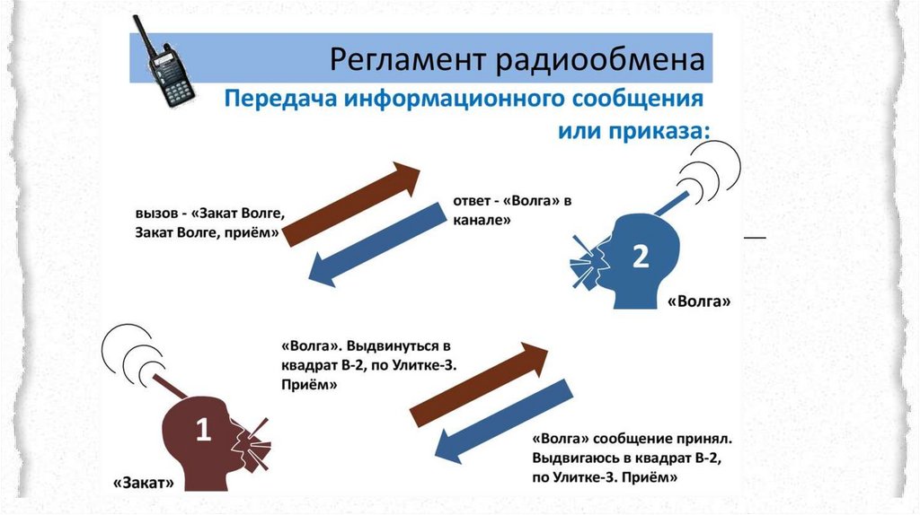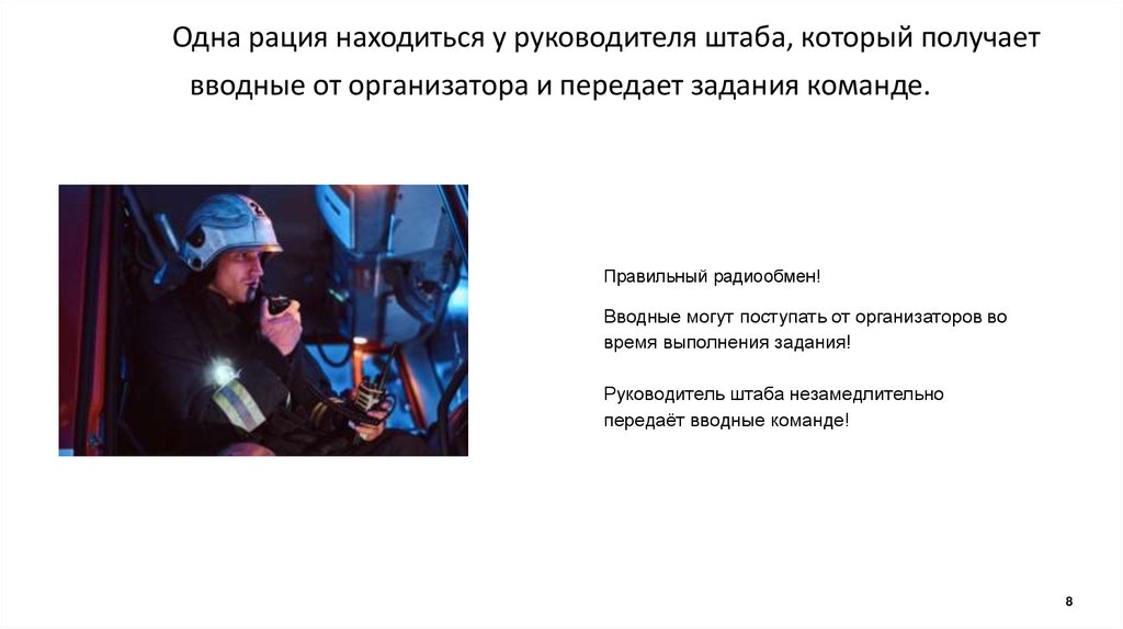 Одна рация находиться у руководителя штаба, который получаетвводные от организатора и передает задания команде.