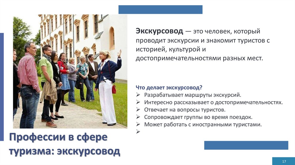 Экскурсовод — это человек, которыйпроводит экскурсии и знакомит туристов с