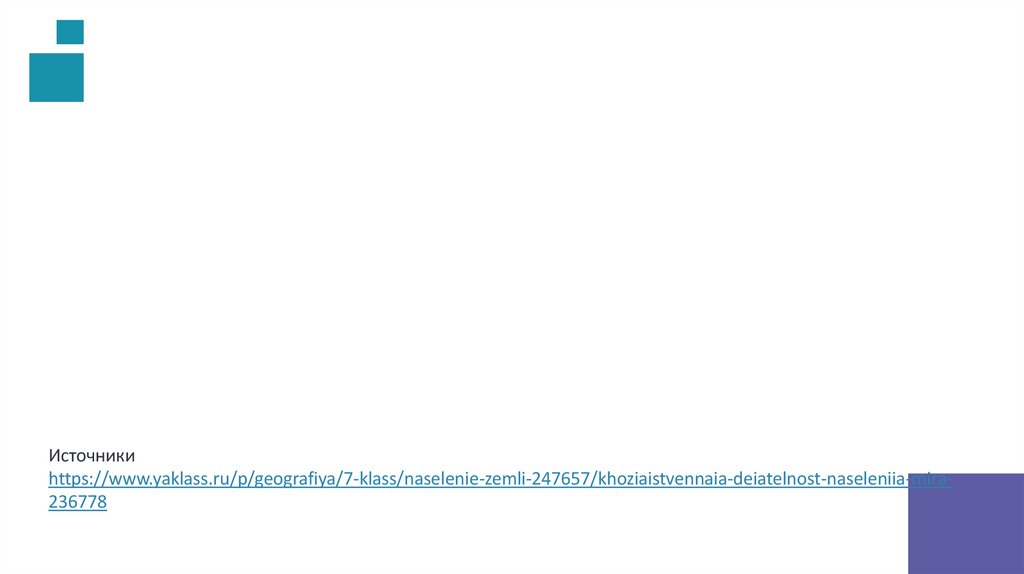Источникиhttps://www.yaklass.ru/p/geografiya/7-klass/naselenie-zemli-247657/khoziaistvennaia-deiatelnost-naseleniia-mira236778