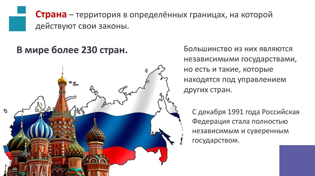 Страна – территория в определённых границах, на которойдействуют свои законы.