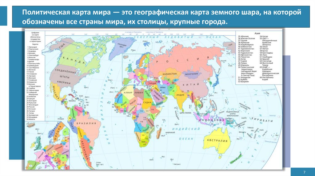 Политическая карта мира — это географическая карта земного шара, на которойобозначены все страны мира, их столицы, крупные города.