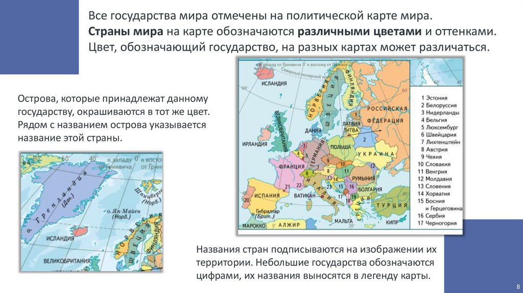 Все государства мира отмечены на политической карте мира.Страны мира на карте обозначаются различными цветами и оттенками.
