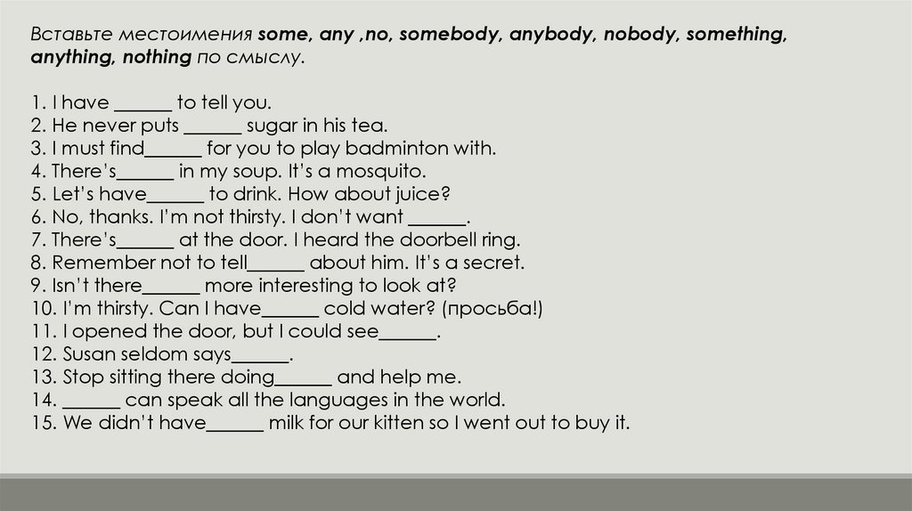 Вставьте местоимения some, any ,no, somebody, anybody, nobody, something,anything, nothing по смыслу.