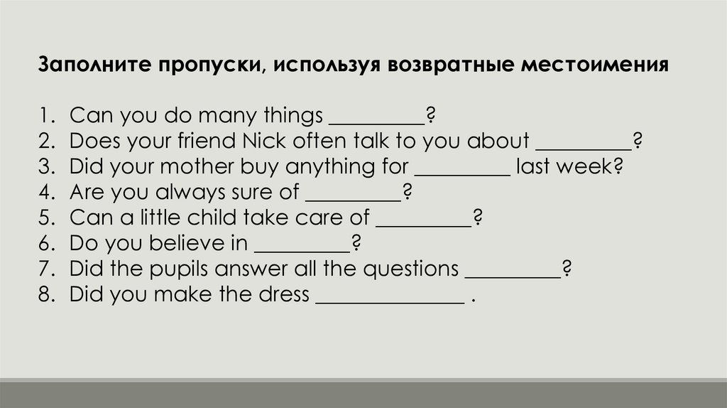 Заполните пропуски, используя возвратные местоимения1. Can you do many things _________?