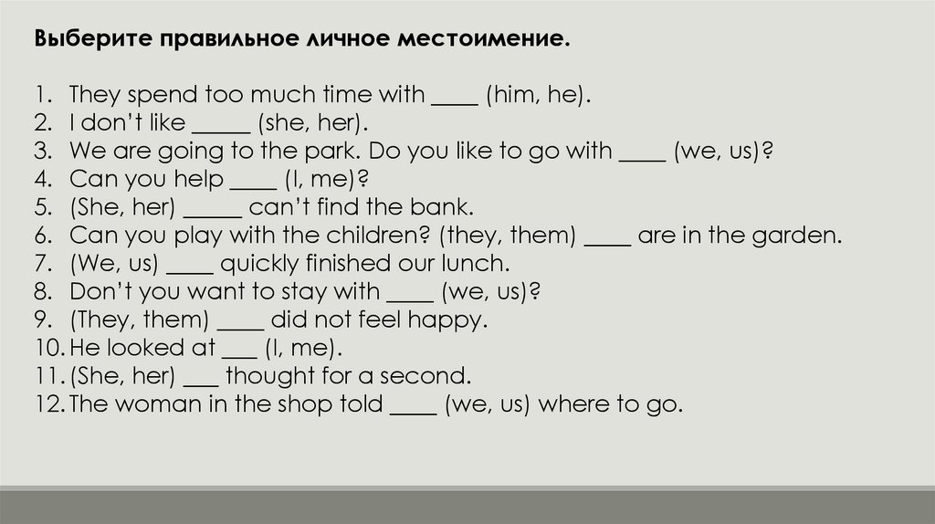 Выберите правильное личное местоимение.1. They spend too much time with ____ (him, he).
