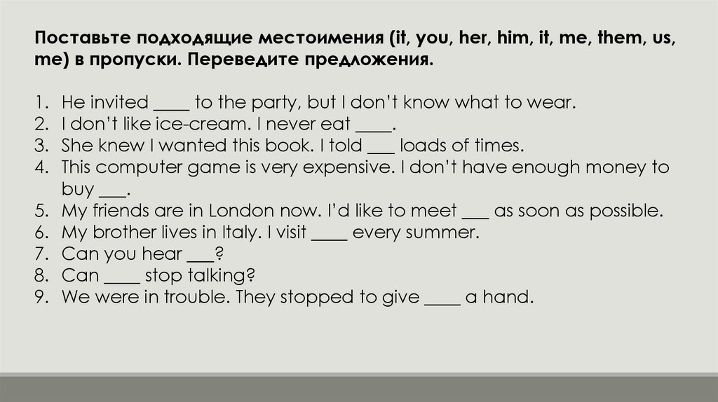 Поставьте подходящие местоимения (it, you, her, him, it, me, them, us,me) в пропуски. Переведите предложения.