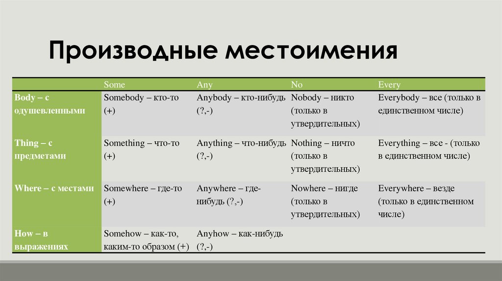 Местоимение any и все его производные обычно употребляются в отрицательных