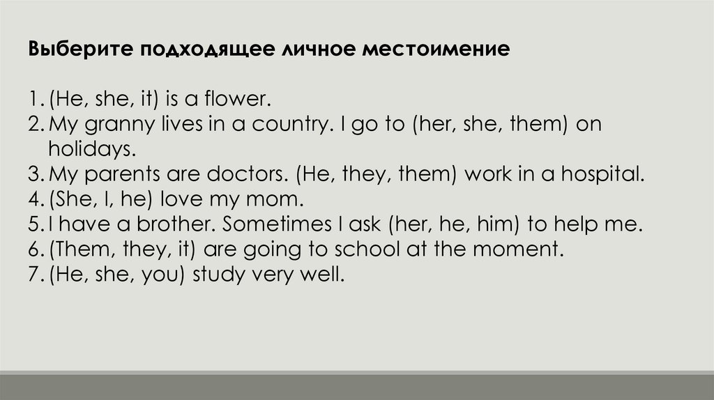 Выберите подходящее личное местоимение1. (He, she, it) is a flower.