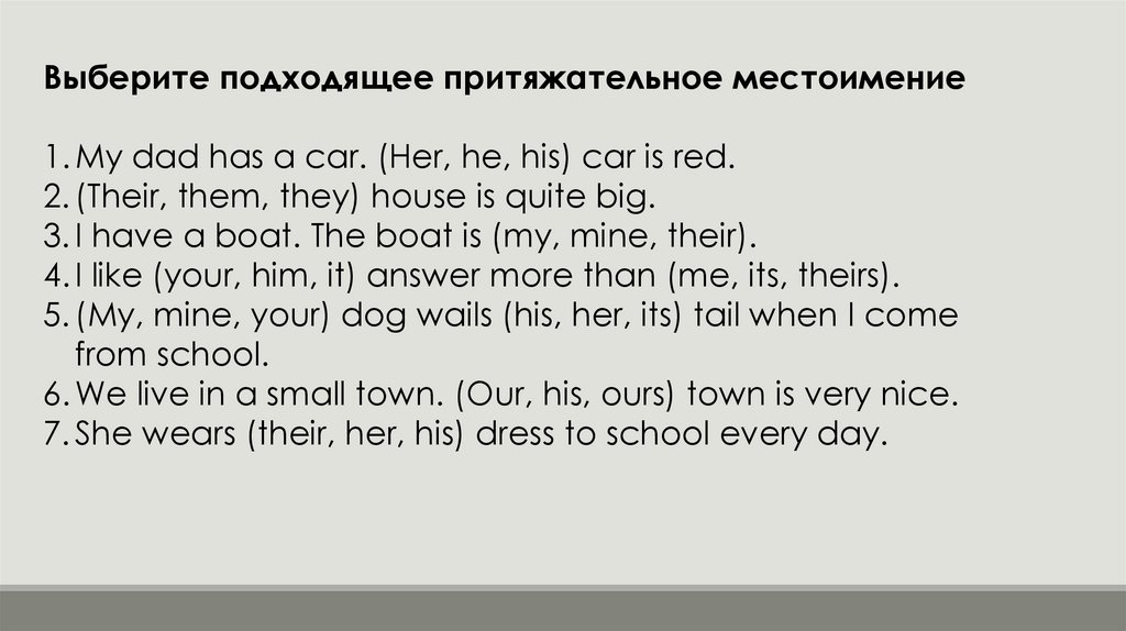 Выберите подходящее притяжательное местоимение1. My dad has a car. (Her, he, his) car is red.
