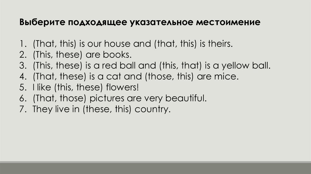 Выберите подходящее указательное местоимение1. (That, this) is our house and (that, this) is theirs.