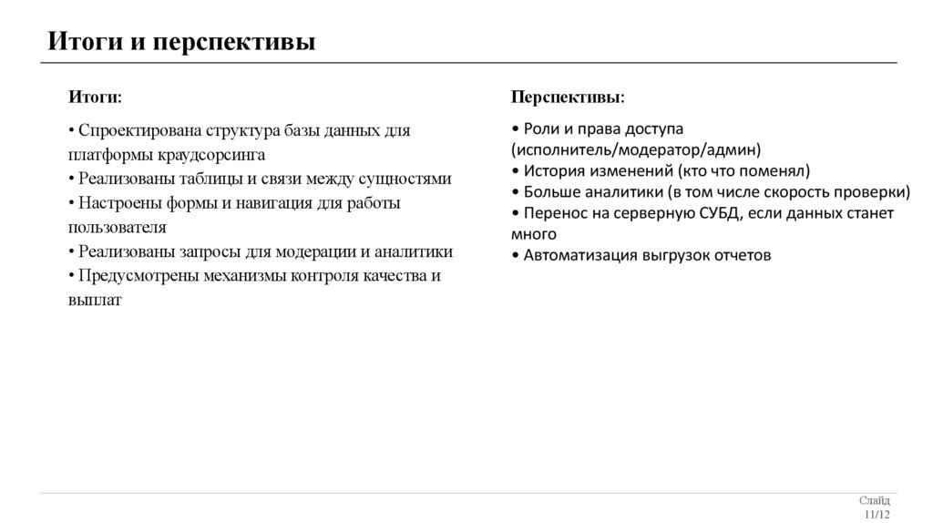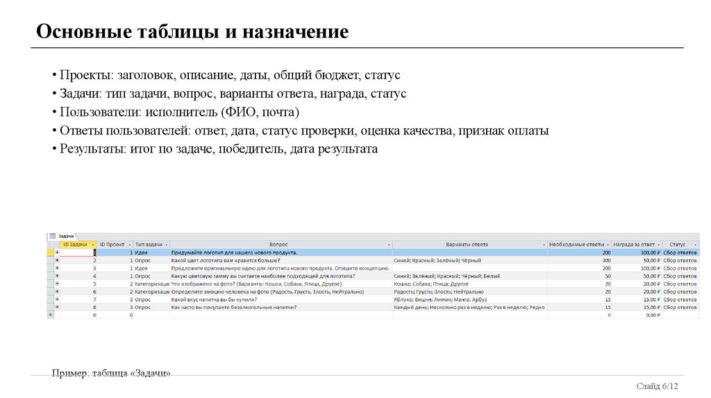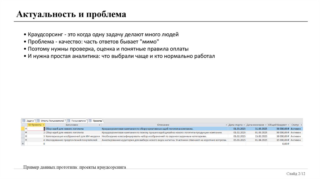 Цель и задачи работыЦель: сделать рабочий прототип базы данных для краудсорсинга в Microsoft Access (проекты, задачи,