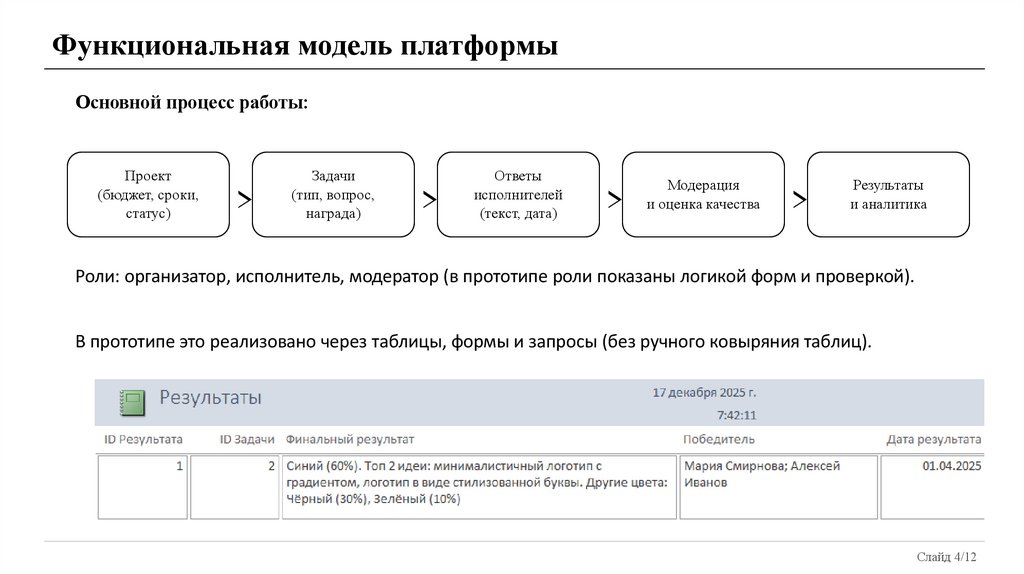 Результат: прототип обеспечивает хранение, модерацию, оценку качества и подготовку итогов по задачам