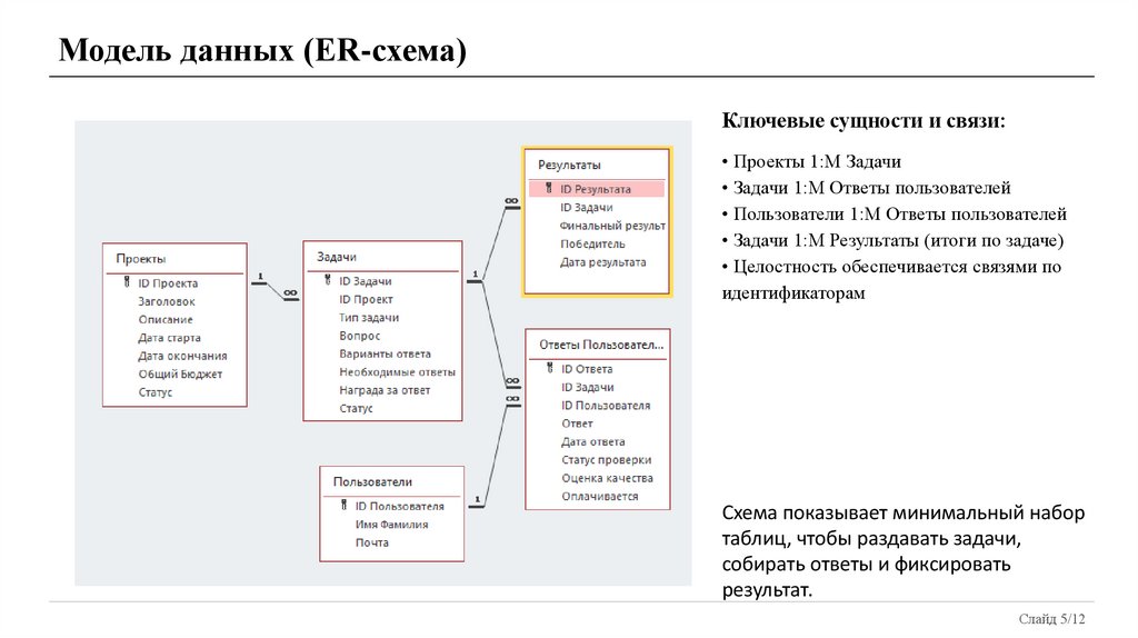 • Целостность связей: пользователь - ответ, задача - ответ, проект - задача