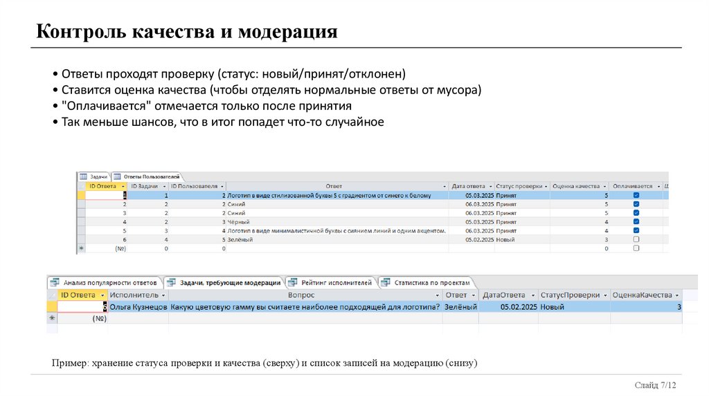 Контроль качества и модерация• Ответы проходят проверку (статус: новый/принят/отклонен)