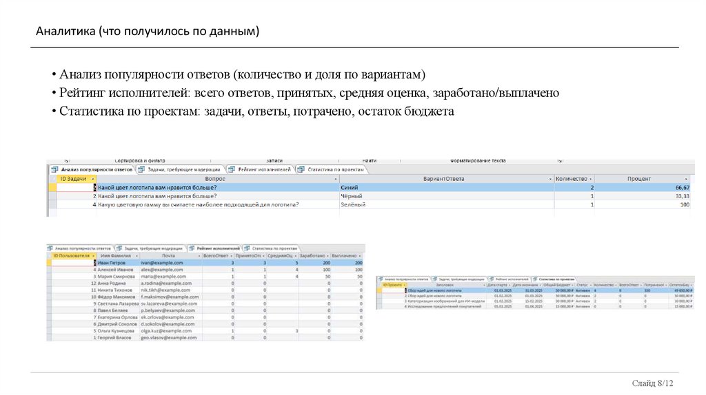 Аналитика (что получилось по данным)• Анализ популярности ответов (количество и доля по вариантам)