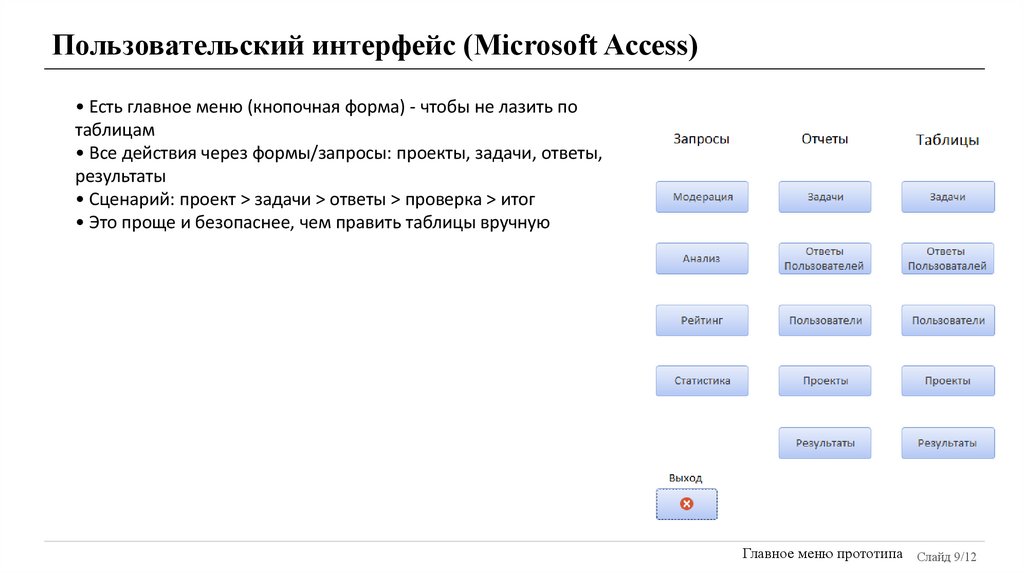 Пользовательский интерфейс (Microsoft Access)• Есть главное меню (кнопочная форма) - чтобы не лазить по