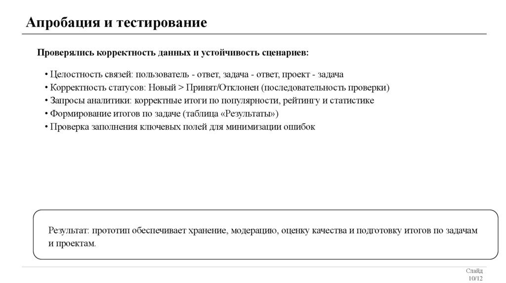 Апробация и тестированиеПроверялись корректность данных и устойчивость сценариев: