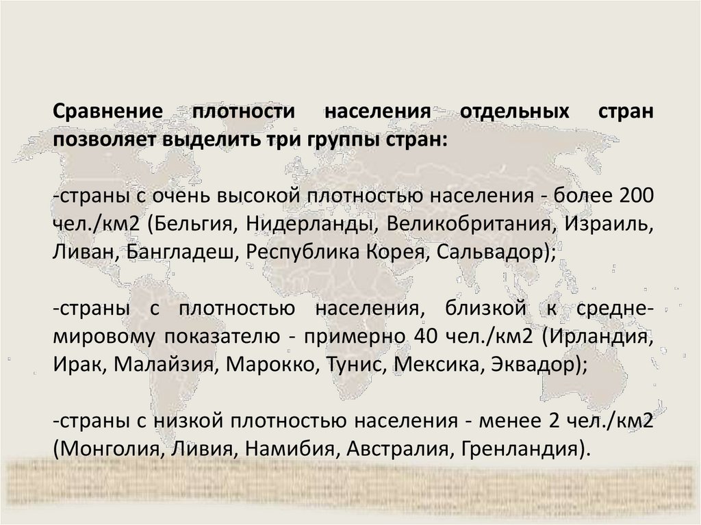 Сравнение плотности населения отдельныхпозволяет выделить три группы стран: