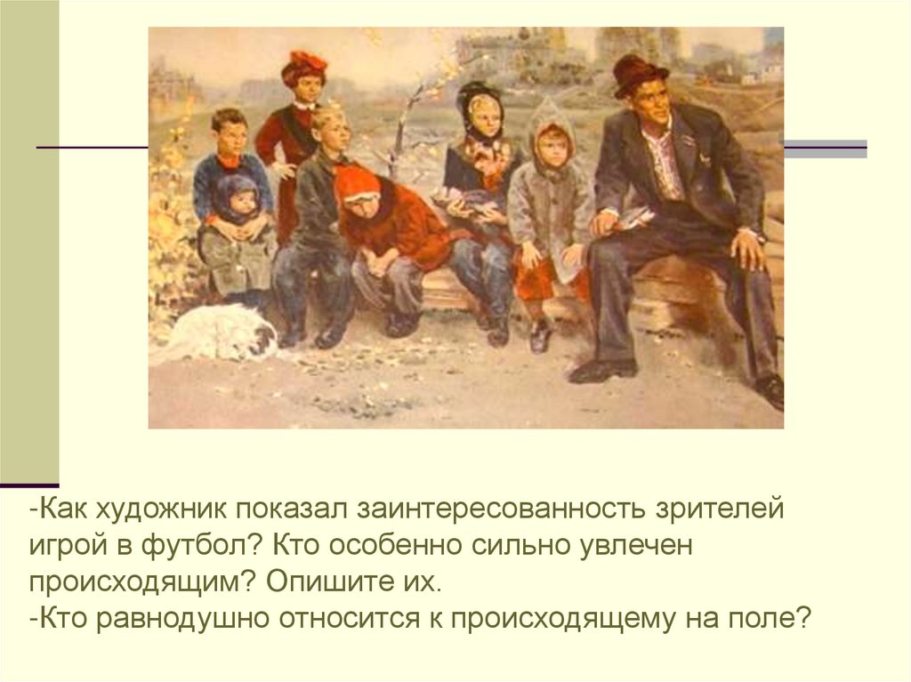-Как художник показал заинтересованность зрителейигрой в футбол? Кто особенно сильно увлечен
