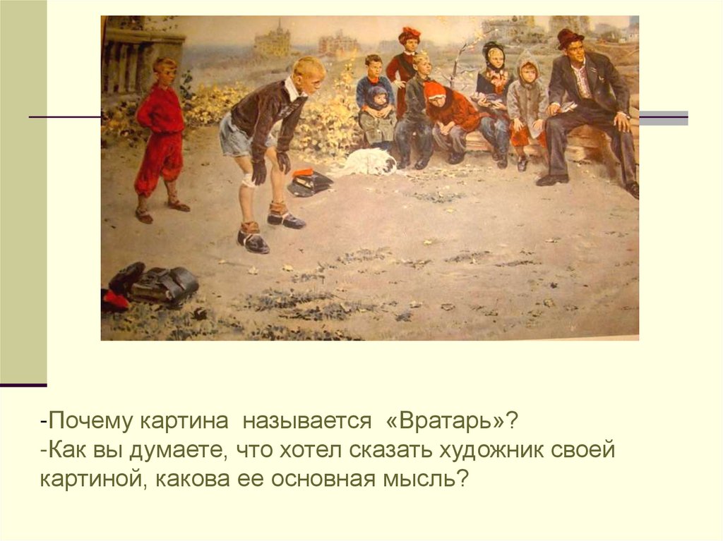 -Почему картина называется «Вратарь»?-Как вы думаете, что хотел сказать художник своей