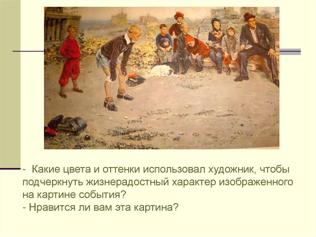 - Какие цвета и оттенки использовал художник, чтобыподчеркнуть жизнерадостный характер изображенного