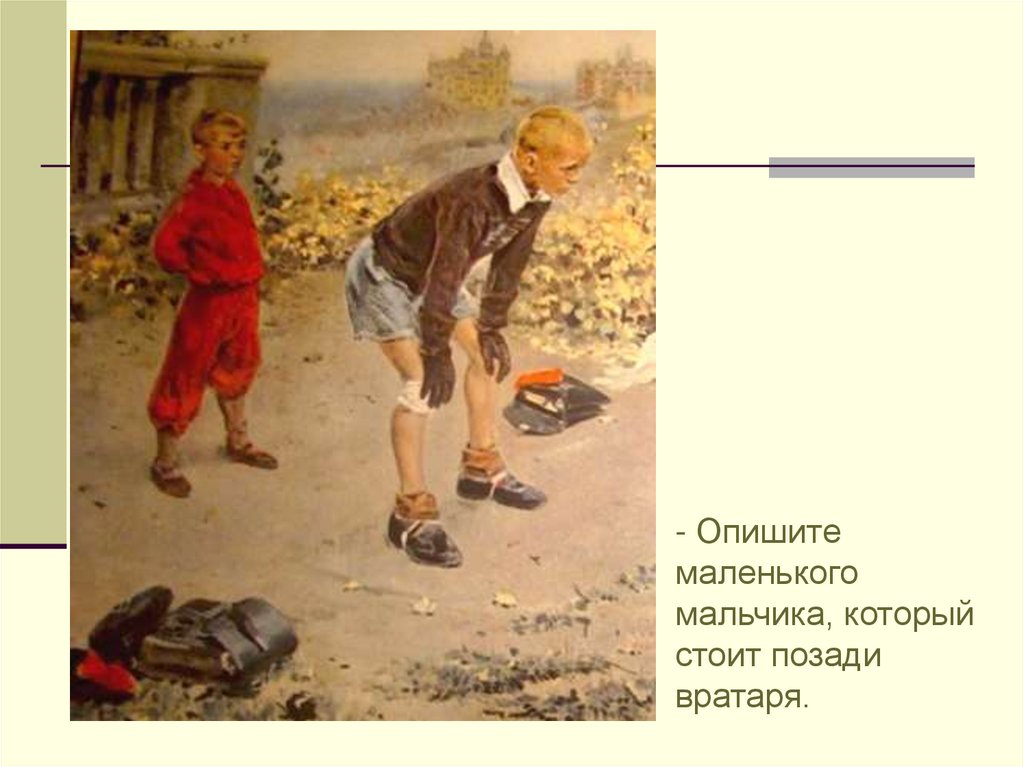 -Кто является главным действующим лицом картины?-Каким изобразил художник вратаря? Опишите его позу,