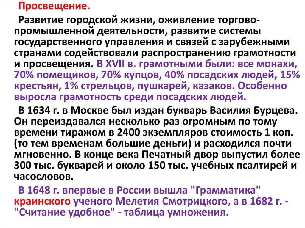 и просвещения. В XVII в. грамотными были: все монахи,