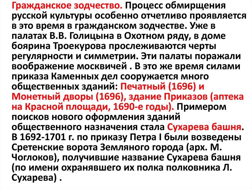 Гражданское зодчество. Процесс обмирщениярусской культуры особенно отчетливо проявляется