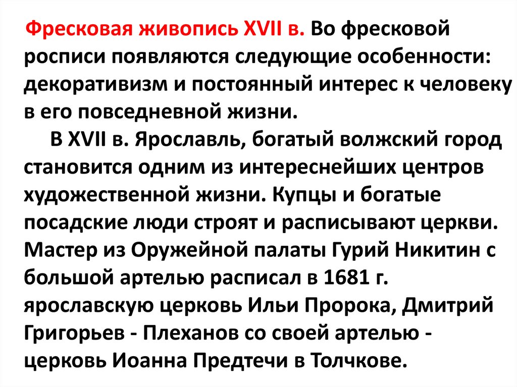 Фресковая живопись XVII в. Во фресковойросписи появляются следующие особенности: